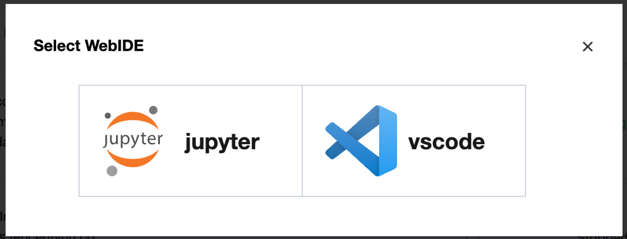 Click Open to access a dev machine instance. Currently, either Jupyter Notebook or VS Code is used to open a dev machine instance for online coding.