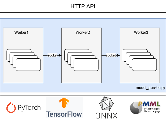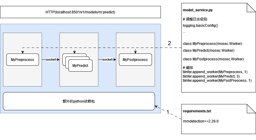 import tiinferfrom mosec import Workerfrom typing import Dict, Anyclass MyPreprocess(Worker):def forward(self, data: Dict) -> Any:# Input is a Dict converted from JSON and requires some necessary pre-processing.class MyPredict(Worker):def __int__(self):super.__init__()# Read and load the model.def forward(self, data: Any) -> Any:# The input is the result of pre-processing. The inference result is obtained after inference by calling the model.class MyPostprocess(Worker):def forward(self, data: Any) -> Dict:# The input is the inference result. Convert it into a Dict through post-processing and return it as JSON to the caller.# Orchestration handling process: 1 x pre-processing worker > 2 x inference workers > 1 x post-processing workertiinfer.append_worker(MyPreprocess, 1)tiinfer.append_worker(MyPredict, 2)tiinfer.append_worker(MyPostprocess, 1)