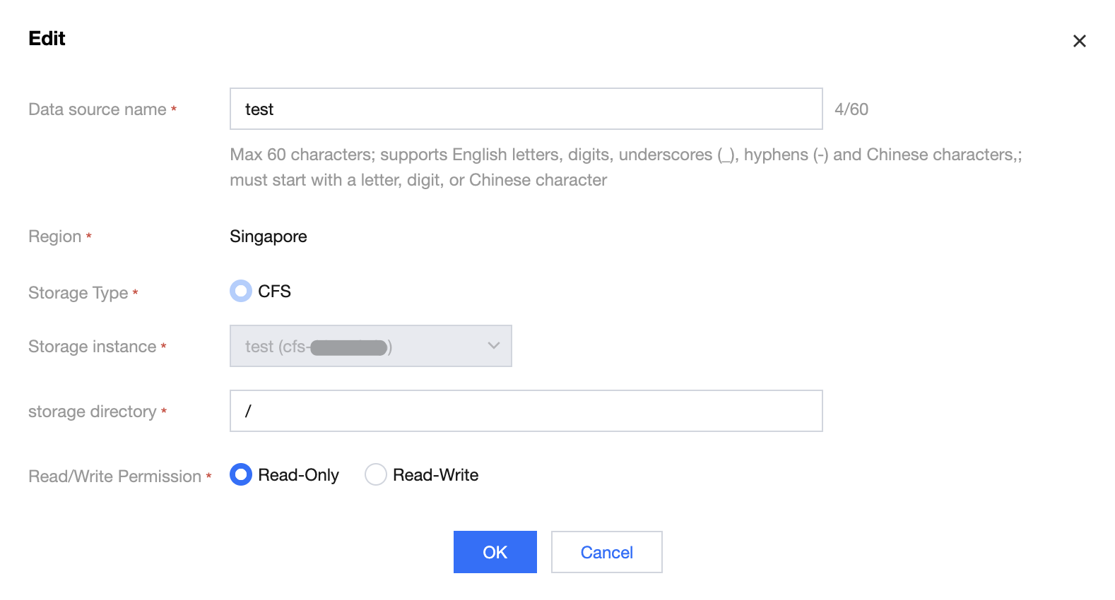 The configuration parameters match the newly added data source. Existing information will be auto-filled during editing. Modification of "name/storage directory/read and write permissions" is supported. The type and name/ID of the storage instance cannot be modified.