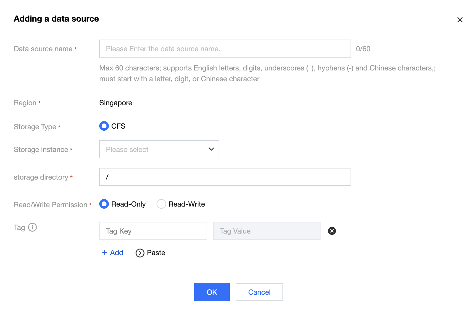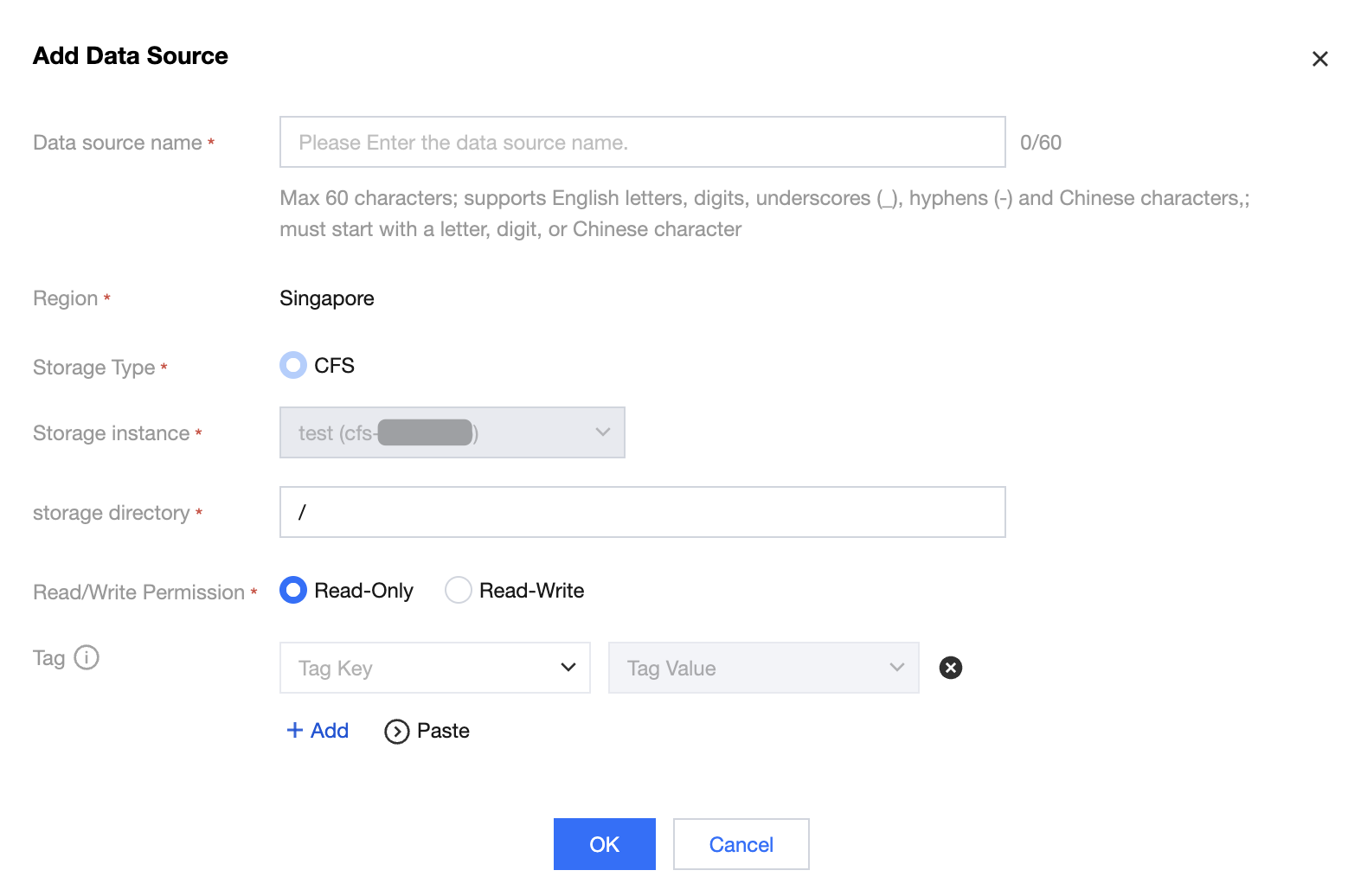 Data Source Name | 1. Required. Length not exceeding 60 characters; supports Chinese, English, digits, underscores (_), and hyphens (-). Must start with a Chinese character, letter, or digit. 2. Duplicate name check: "Data source name" cannot be repeated (ALL storage instances). Meanwhile, "storage location + read and write permissions" as a unique key cannot be duplicated at the same time. |