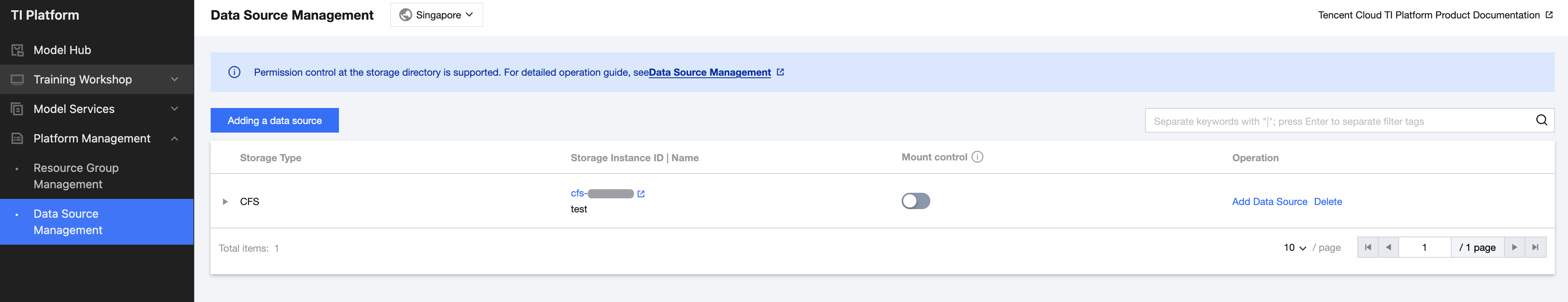 Data source management supports registering directories of storage instances (CFS/GooseFSx) as data sources for fast mounting. It also supports permission control for storage directories through Cloud Access Management (CAM) and Tag.