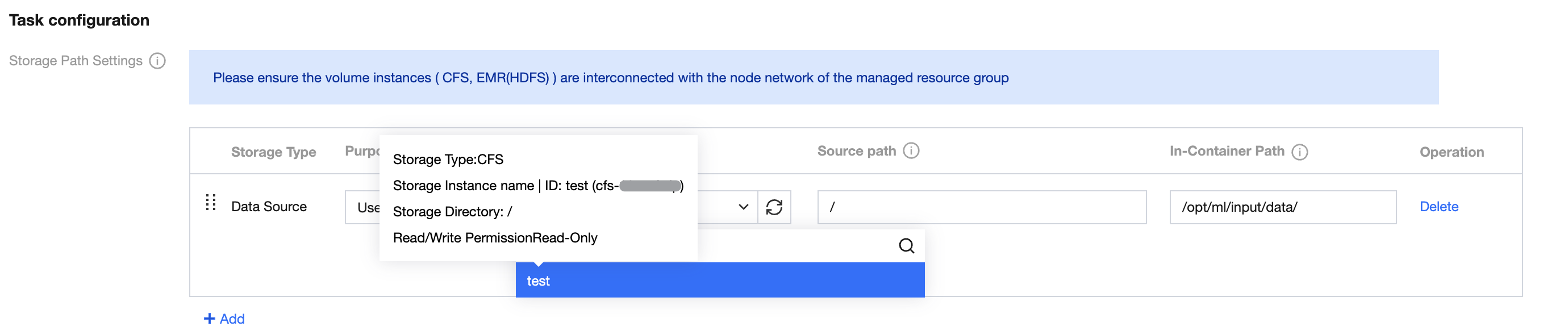 storage instance | 1. Required, the option source corresponds to the purchased storage instance information under the corresponding storage type. (Note: Outside the brackets refers to the instance name, inside the brackets refers to the instance ID.) 2. Note: The instance here refers to the purchased storage instance on Tencent Cloud. TI-ONE merely registers and binds it, not creates a separate instance. |