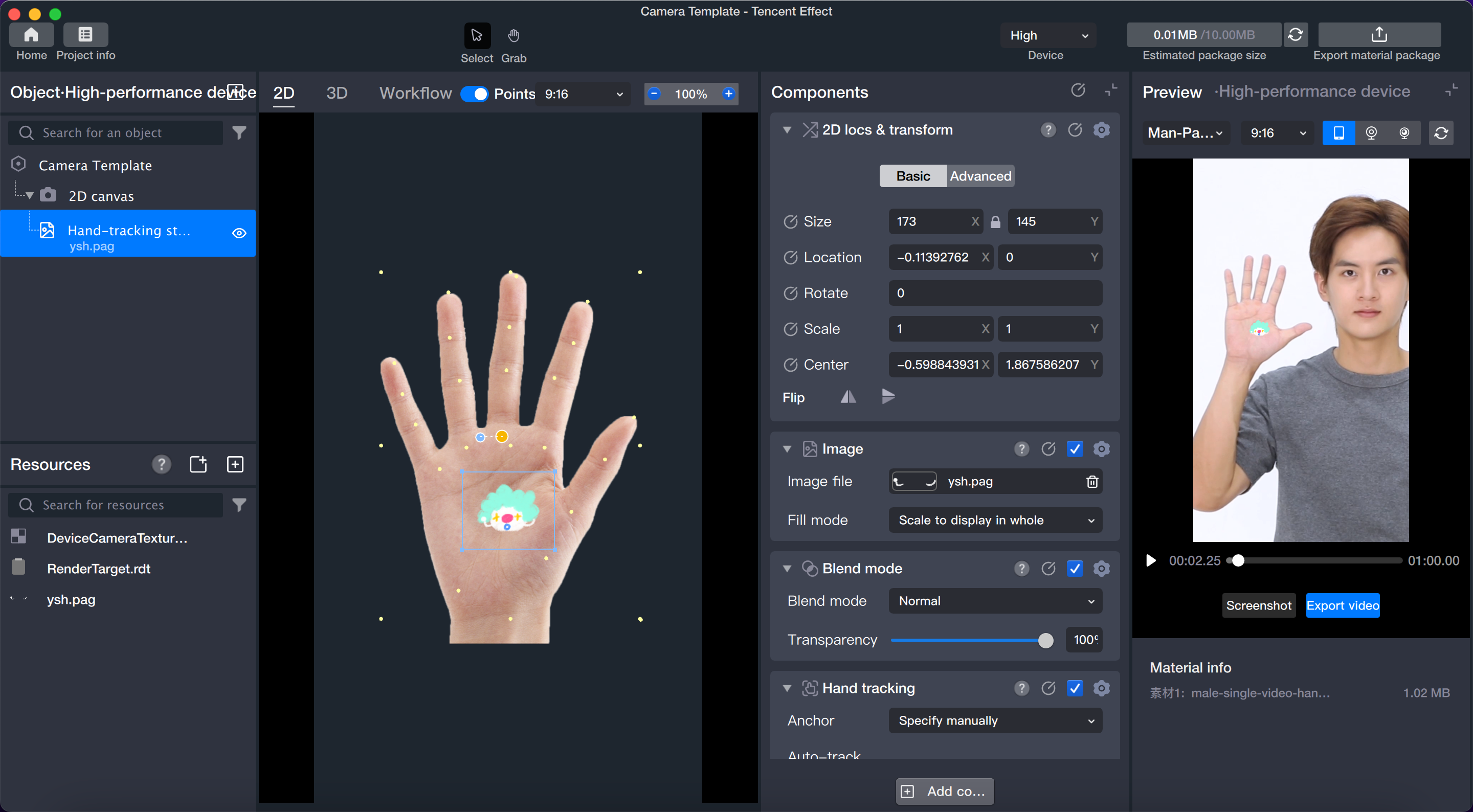 2. After setup, start the preview to see the gesture-following sticker in action.