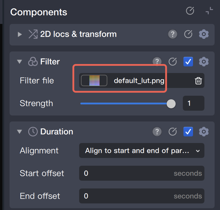 2. In the filter component panel on the right, import the LUT file and adjust the opacity as needed.