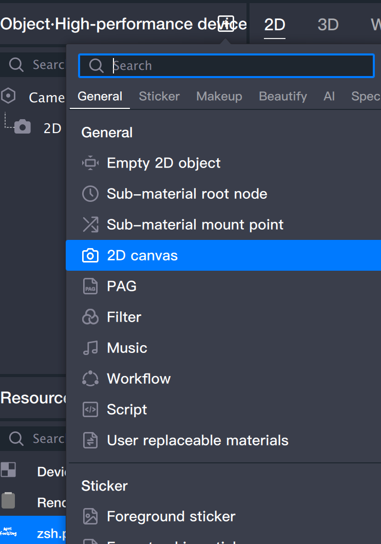2.1 Add a 2D canvas in the object panel.