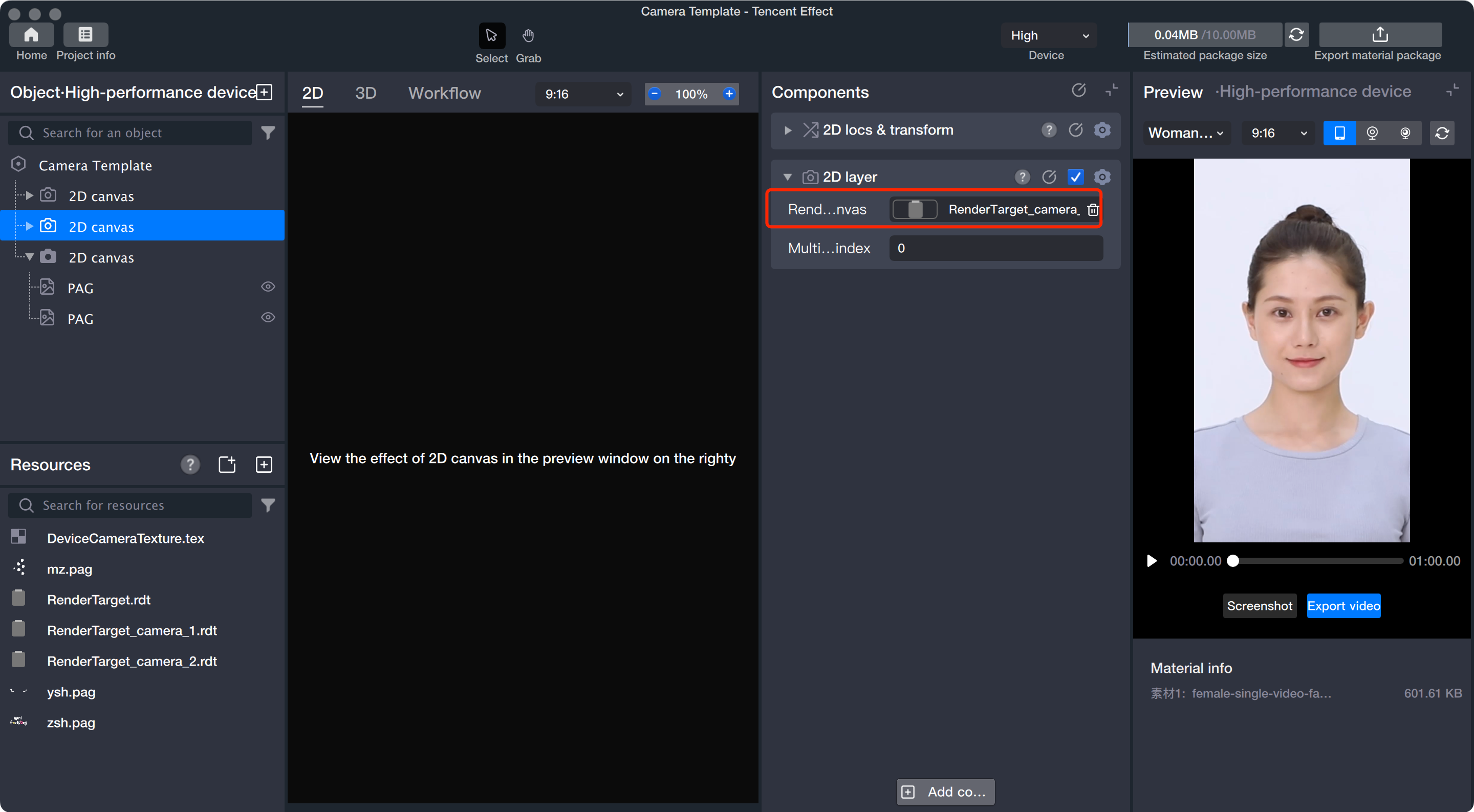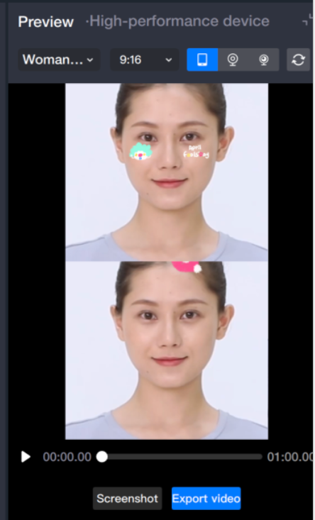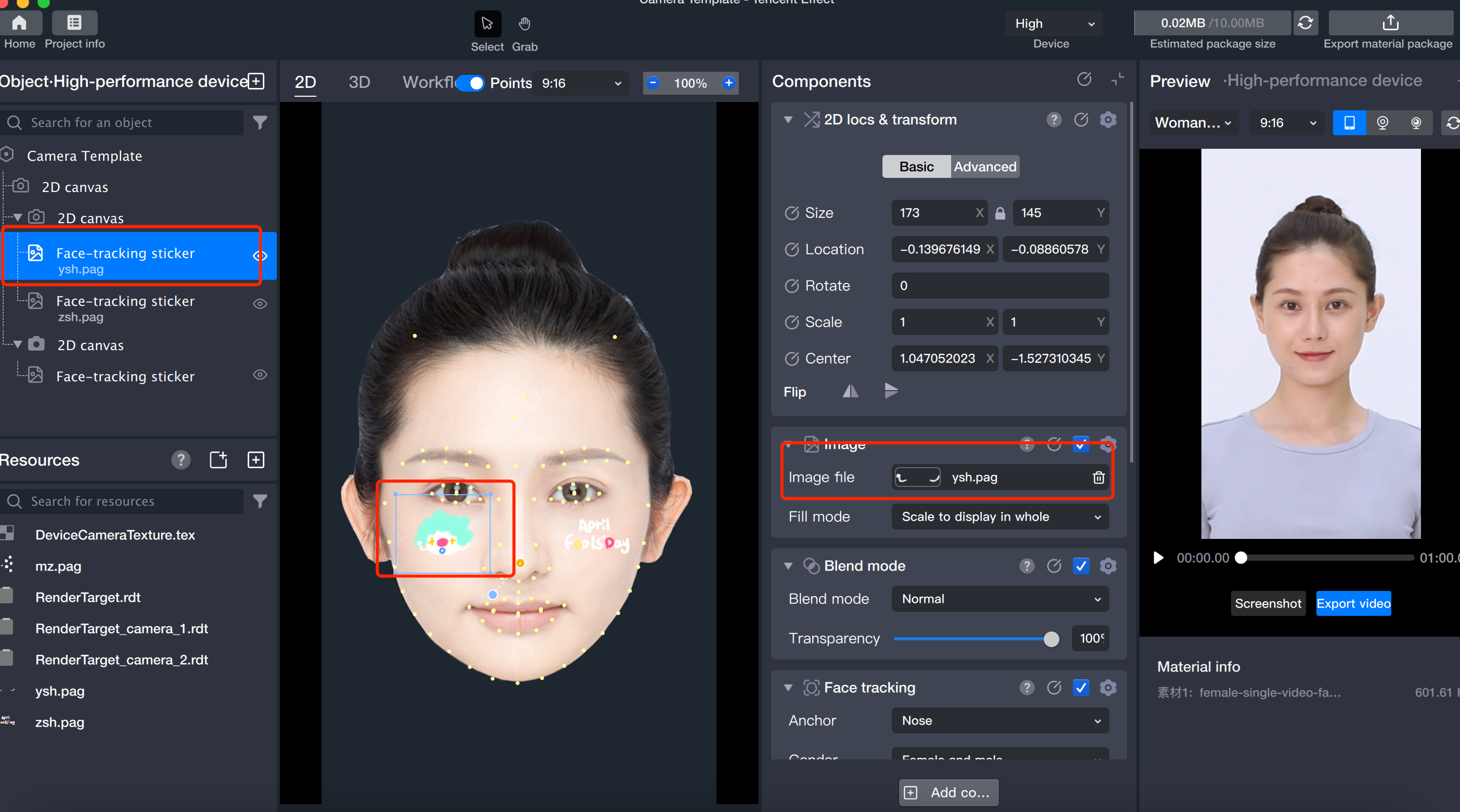 3. Add face-following stickers to the two 2D canvases and preview the effect.