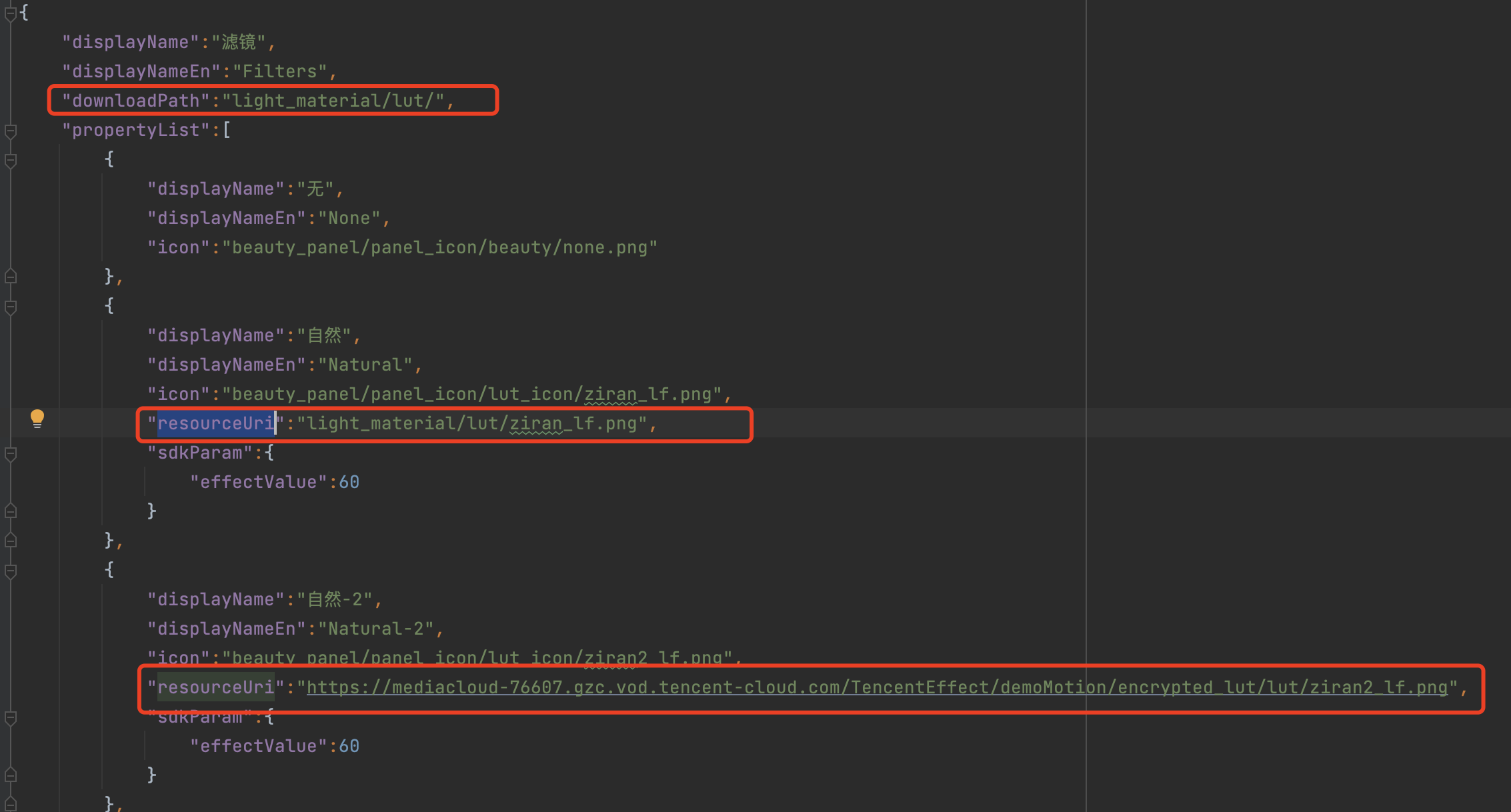 resourceUri | If your material needs to be downloaded via network, configure the network address here, as in the third red box in the image above. However, if your filter material is local, configure the corresponding local address according to the image above. |
