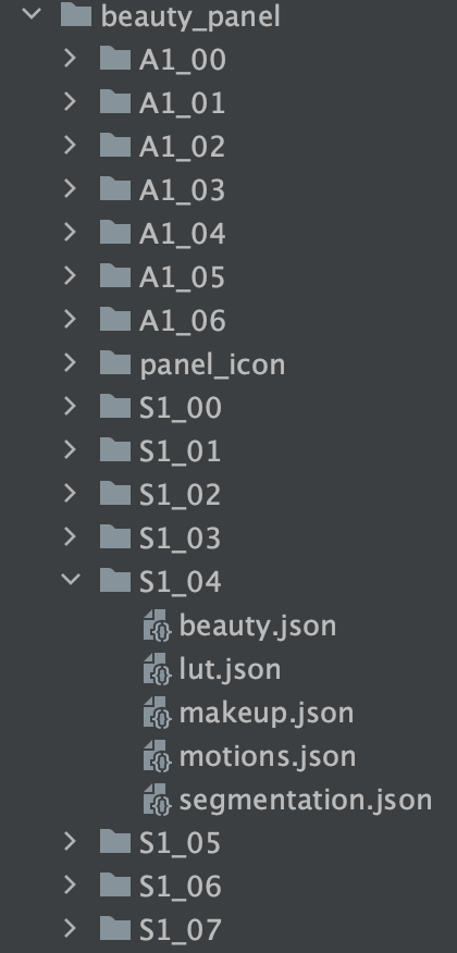 demo/src/main/assets/beauty_panel, or click here to download and unzip it. The file includes configurations for beauty, body beauty, filters, dynamic effect stickers, and segmentation properties. Select a set of JSON files according to your package type and place them in the assets/beauty_panel folder in your project (the panel_icon folder also needs to be placed in this directory).