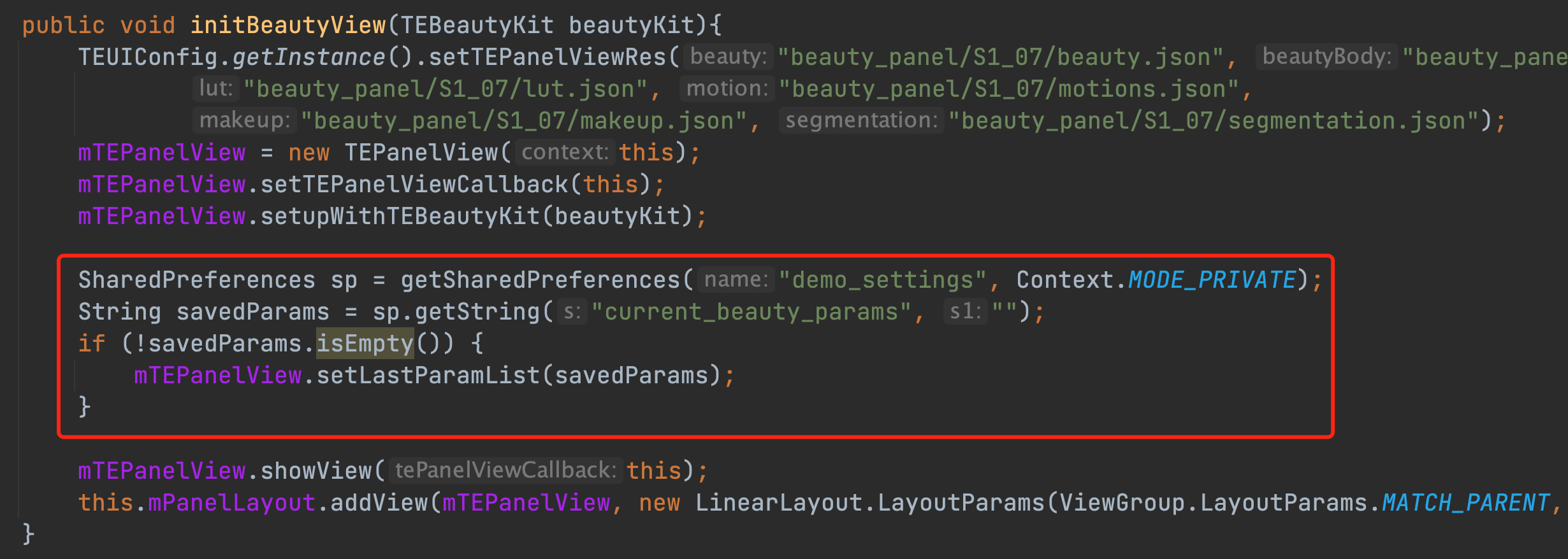 //TECameraBaseActivity.javaTEBeautyKit.create(this.getApplicationContext(), beautyKit -> { mBeautyKit = beautyKit; initBeautyView(beautyKit); });public void initBeautyView(TEBeautyKit beautyKit){ TEUIConfig.getInstance().setTEPanelViewRes("beauty_panel/S1_07/beauty.json", "beauty_panel/S1_07/beauty_body.json", "beauty_panel/S1_07/lut.json", "beauty_panel/S1_07/motions.json", "beauty_panel/S1_07/makeup.json", "beauty_panel/S1_07/segmentation.json"); mTEPanelView = new TEPanelView(this); mTEPanelView.setTEPanelViewCallback(this); mTEPanelView.setupWithTEBeautyKit(beautyKit); mTEPanelView.showView(this); this.mPanelLayout.addView(mTEPanelView, new LinearLayout.LayoutParams(ViewGroup.LayoutParams.MATCH_PARENT, ViewGroup.LayoutParams.WRAP_CONTENT)); }
