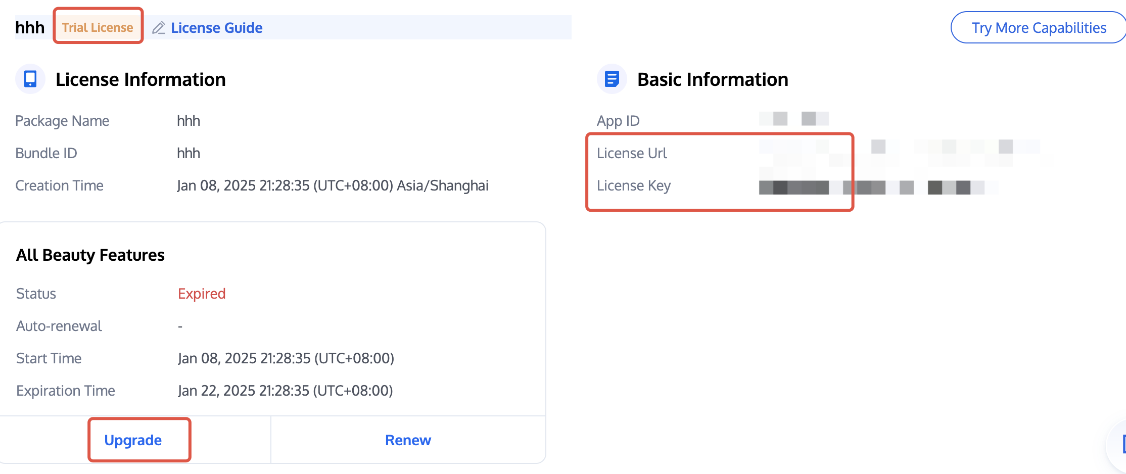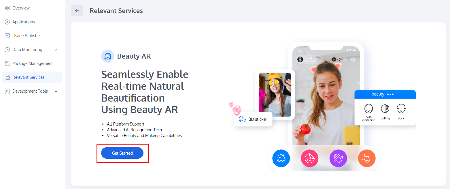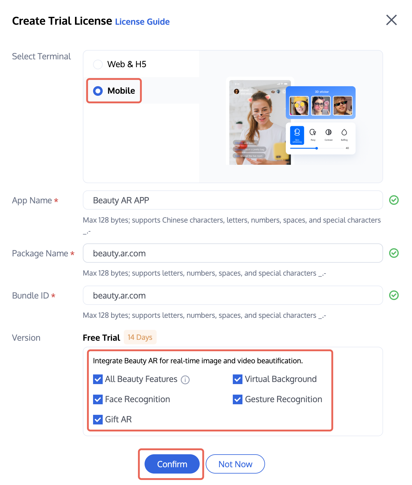 App Name, Package Name, and Bundle ID. Check the features you want to trial: All Beauty Features, Virtual Background, Face Recognition, Gesture Recognition, Gift AR, then click Confirm.