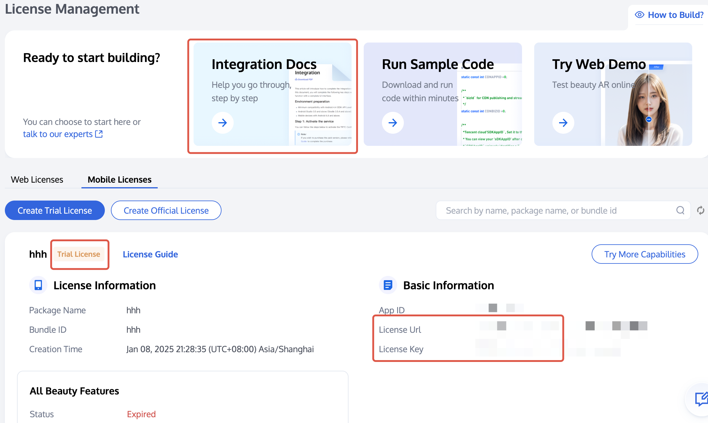 License Url and License Key will be used in the integration guide.