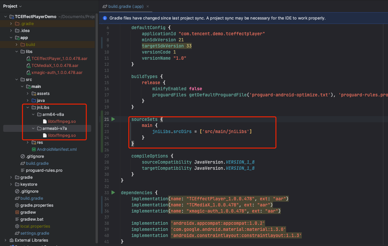 Last step, need to configure so file: Download the so file in the jniLibs_txffmpeg_so.zip link to local, then decompress it. Copy the so file in the decompressed jniLibs directory to the app's src/main directory, and configure the corresponding path in app/build.gradle: sourceSets {
