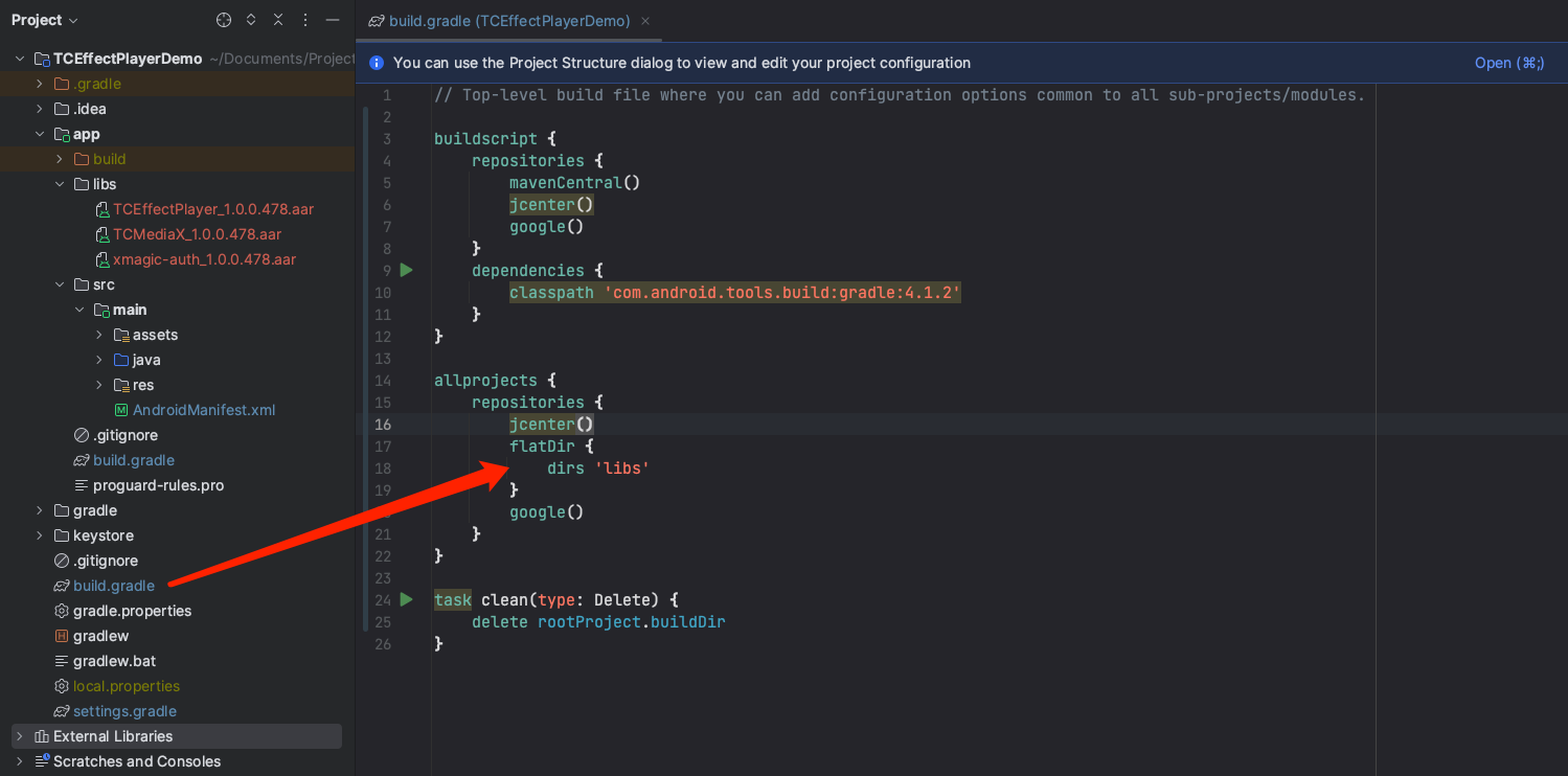 3. In the build.gradle in the root directory of the project, add flatDir and specify the local repository path.