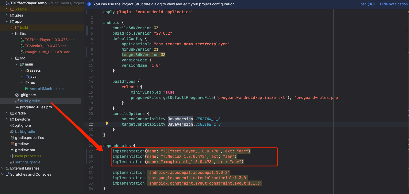 4. Add dependency on Gift AR SDK. In app/build.gradle, add code to reference the aar package.