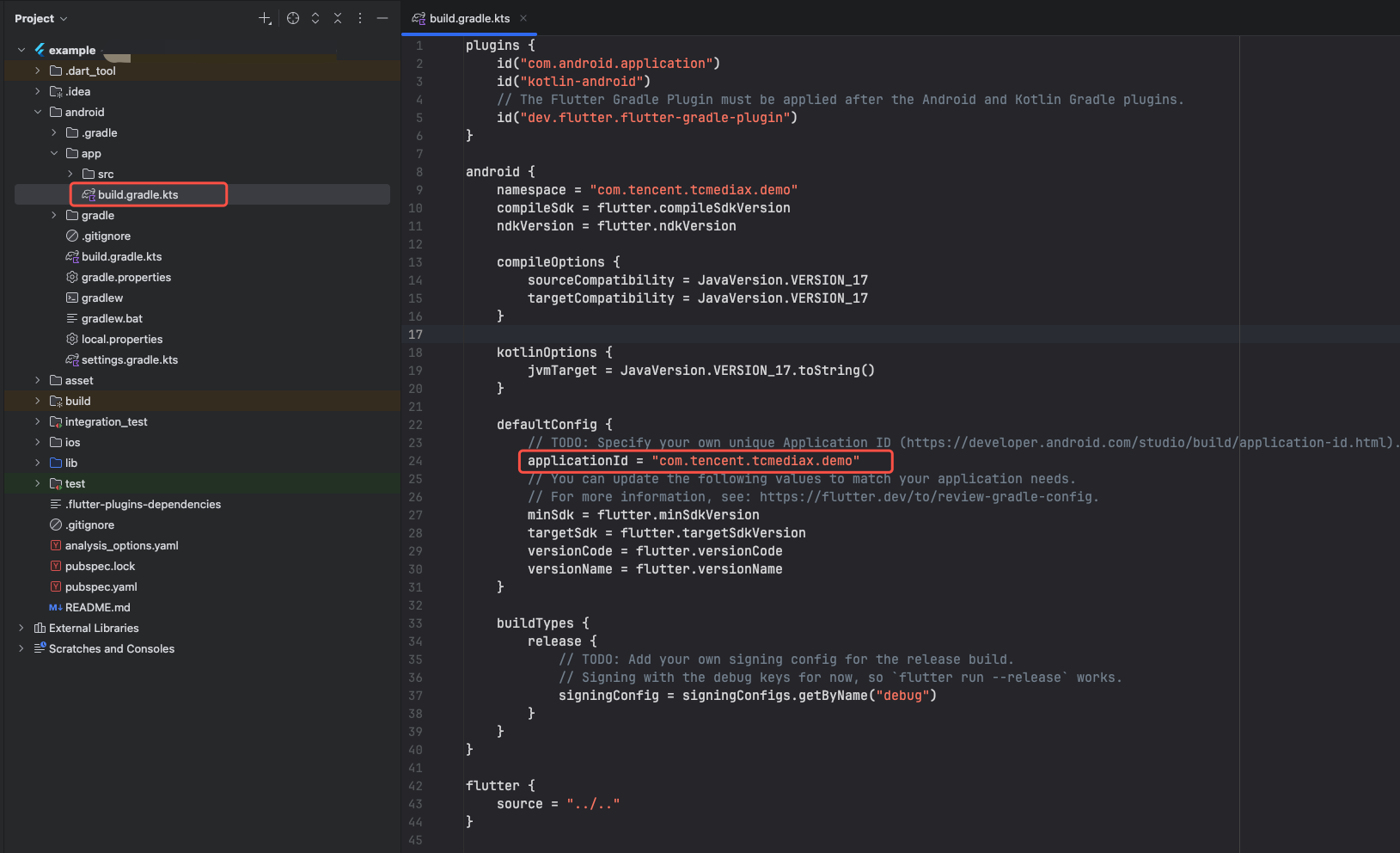 1. Open the example/android/app/build.gradle.kts file with a code editing tool, find the applicationId defined in it, and change it to the Android Package corresponding to the previously filled License, as shown below:
