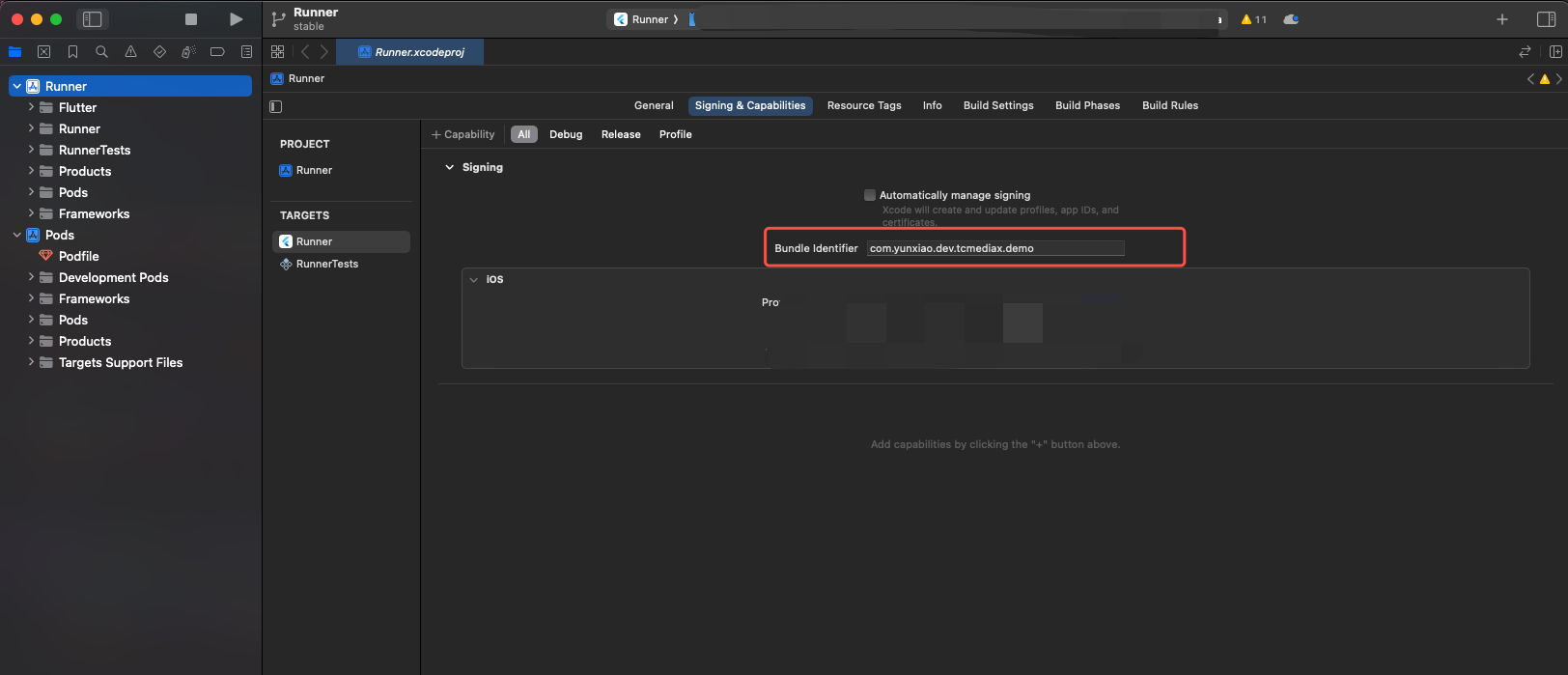 1. Under the example/ios directory, run command: pod install. Wait for execution to end, then use XCode development tool to open the Runner.xcworkspace file in this directory to start the project. Next, modify the project's Bundle Identifier to the iOS BundleId corresponding to the previously filled License, as shown below: