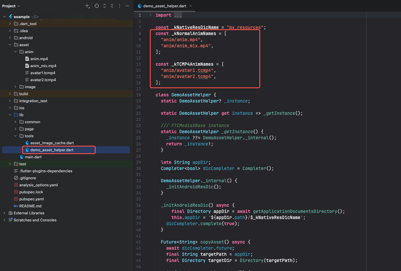 To modify the animation file to be played, you can add the animation file for playback in the example/asset/anim directory. Then open the example/lib/tools/demo_asset_helper.dart file and modify the _kNormalAnimNames (large animation) or _kTCMP4AnimNames (small avatar animation) property at the top. The demo will automatically complete tasks such as copying the animation file, as shown below: