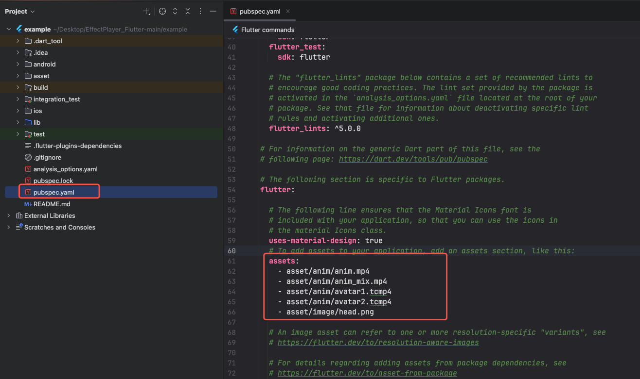 Finally, you need to turn on the example/pubspec.yaml configuration file, add the new animation file to the list of configurations. Afterward, you can run the Demo project directly to experience animation playback.