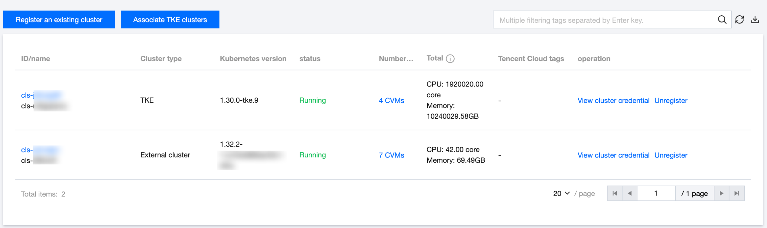 1. Log in to the TDCC Console, and go to the Distributed Infrastructure > Cluster page. 2. On the page that appears, all registered clusters are listed. You can click a cluster name to enter the TKE cluster management page.
