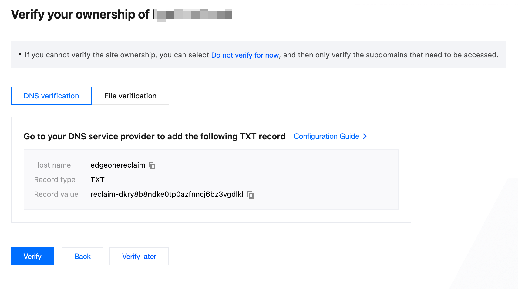 This operation is only required in CNAME connection. If your site is accessed in NS mode, you can directly switch the DNS server to EdgeOne to complete the ownership verification.