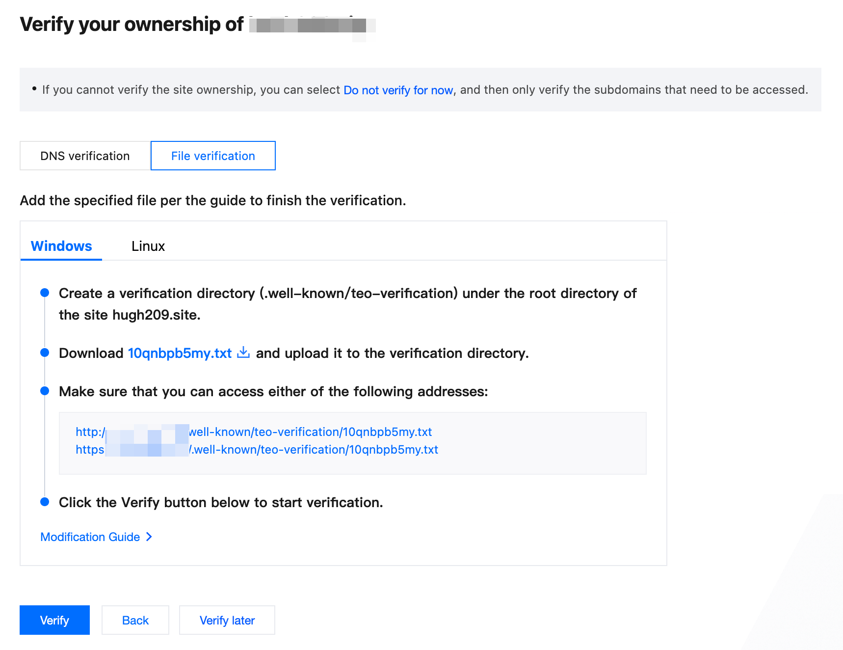 Domain verification: If your company is a multi-level business or provides domain operations and maintenance and you only have permission to configure DNS resolution and the origin server for the subdomain names, you can skip verification when connecting the site. However, all its subdomain names need to be verified before being added.