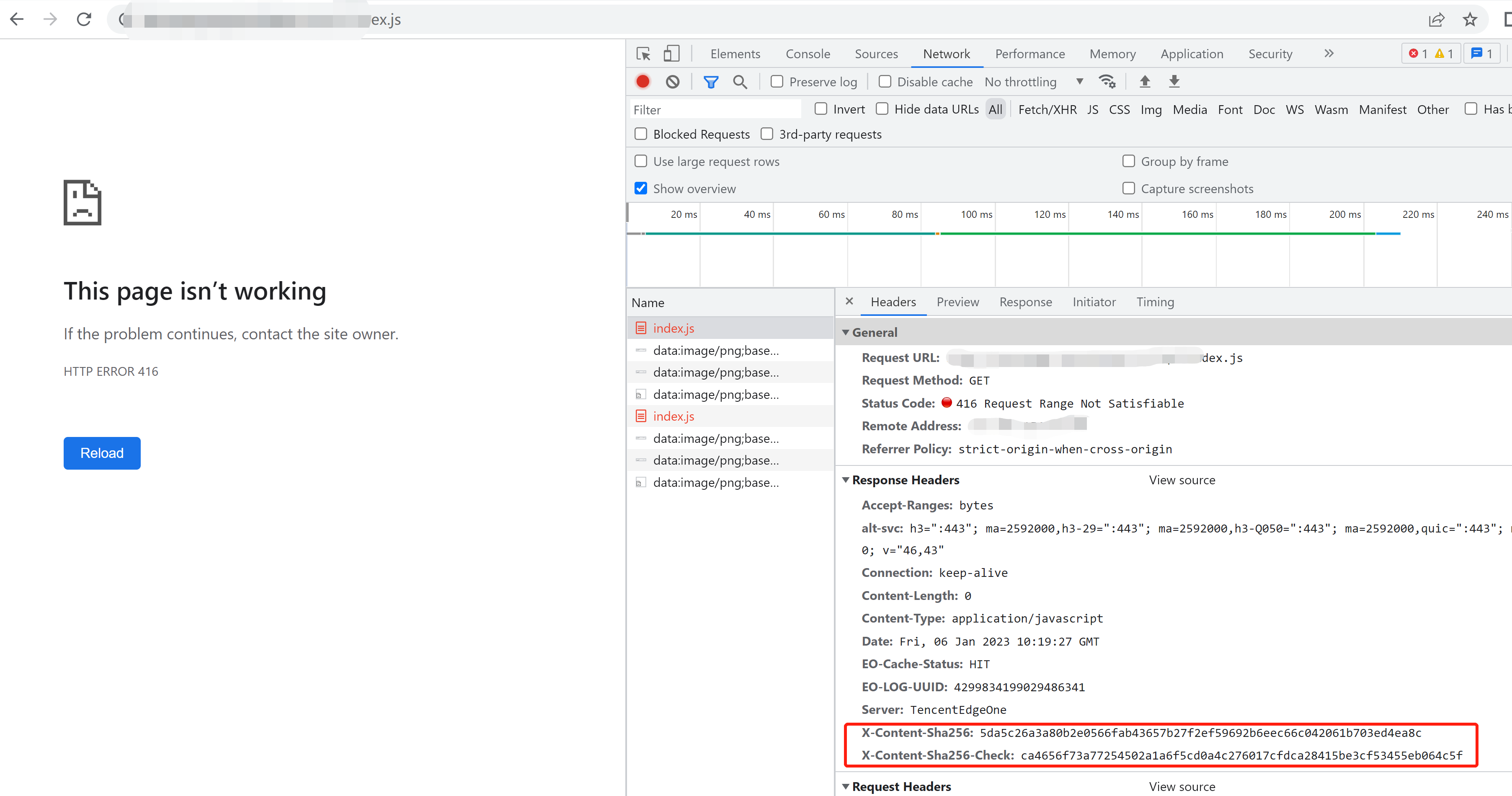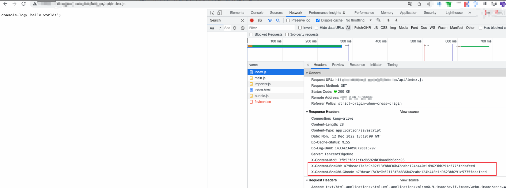 // 支持的文本文件类型const textFileTypes = ['application/javascript','text/html; charset=utf-8','text/css; charset=utf-8','text/xml; charset=utf-8'];// 支持的图片文件类型const imageFileTypes = ['image/jpeg'];function uint8ArrayToHex(arr) {return Array.prototype.map.call(arr, (x) => (('0' + x.toString(16)).slice(-2))).join('');}/*** 算法这里支持 MD5、SHA-1、SHA-256、SHA-384、SHA-512 之一, 大小写不敏感。* 需要注意:这里源站在计算签名时,不要直接对源文件的数据直接进行签名,而是应该加入混淆数据,避免外部攻击者破解。* 然后在此处,也使用同样的方式进行计算对比,从而达到防篡改的目的**/async function checkAndResponse(response, hash, algorithm) {const headers = response.headers;let checkHash = 'sorry! not match';let data = null;const contentType = headers.get('Content-Type');if (textFileTypes.includes(contentType) || imageFileTypes.includes(contentType)) {data = await response.arrayBuffer();}let ret = await crypto.subtle.digest({name: algorithm}, data);checkHash = uint8ArrayToHex(new Uint8Array(ret));headers.append(`X-Content-${algorithm}-Check`, checkHash);// 实时计算签名与源站签名对比,校验不通过返回 416,语义为无法满足用户的请求if (checkHash !== hash) {return new Response(null, {headers,status: 416});}return new Response(data, {headers,status: 200});}async function handleEvent(event) {// 获取源站返回内容,若 EdgeOne 节点存在缓存,则不会回源const response = await fetch(event.request);if (response.status === 200) {const headers = response.headers;// 源站内容签名头const hash = headers.get('X-Content-Sha256');if (hash) {// 计算签名是否匹配,算法这里支持 MD5、SHA-1、SHA-256、SHA-384、SHA-512, 大小写不敏感。return checkAndResponse(response, hash, 'Sha-256');}}return response;}addEventListener('fetch', event => {event.respondWith(handleEvent(event));});