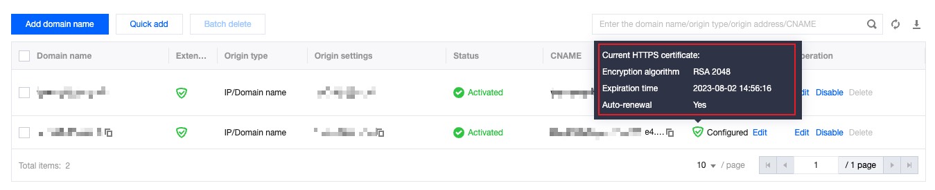 6. Return to the domain management interface, refer to modify CNAME resolution to configure a CNAME record for the current domain. Avoid using regional resolution. 7. Wait for the domain CNAME to take effect. The free certificate will be automatically deployed after the CA issues the certificate. After deployment, enter the HTTPS configuration interface again to view the current certificate status as configured.