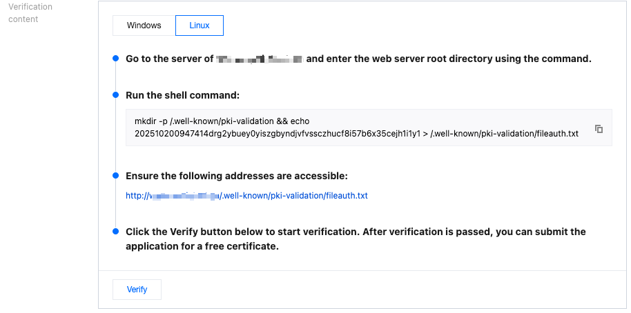 6. View the verification content that needs to be configured. For file verification, you must upload the required .TXT file in the specified directory of the current domain site. Take a Linux server as an example, the configuration method is as follows: