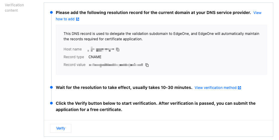 7. After adding the corresponding verification record, it typically takes 5-10 minutes for the changes to take effect. It is recommended to verify the effective status using tools (for example: DNS diagnosis tool or other mdig tools) to confirm the record configuration has taken effect correctly. If only local machine verification is used, it cannot represent that the DNS record has taken effect worldwide. The CA may still reject certificate issuance if the corresponding DNS record value is not detected. It is recommended to proceed to the next step only after full verification. 8. Click Verify. After verification passes, the free certificate application is completed.