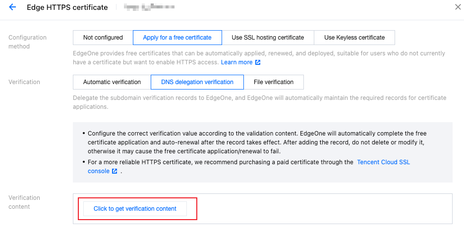 5. Select the configuration mode as Apply for a free certificate, choose the verification method as DNS Delegation Verification, and click to get Verification Content.