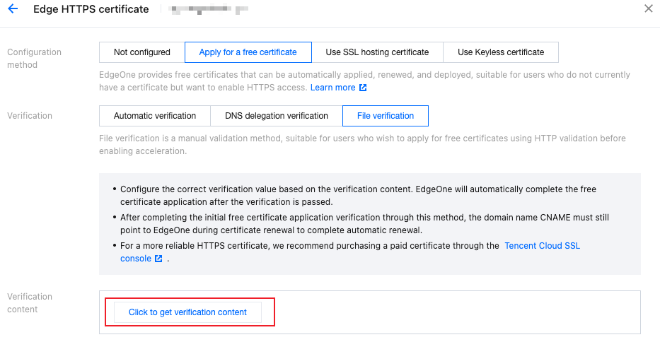 5. Select the configuration mode as Apply for a free certificate, choose the verification method as File Verification, and click to get Verification Content.