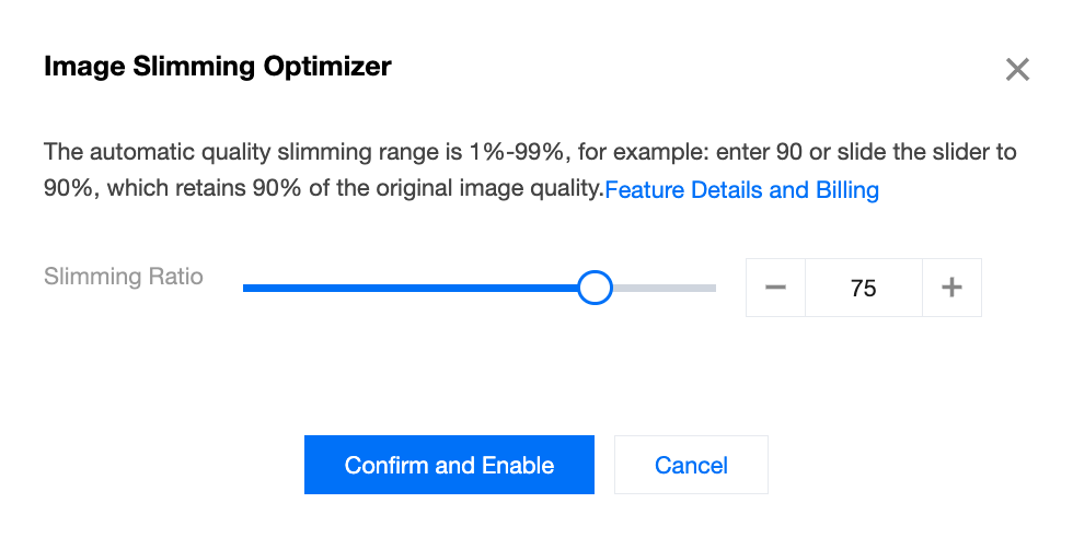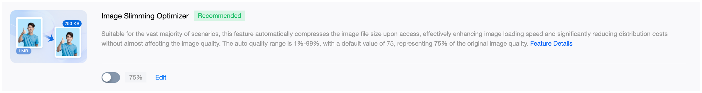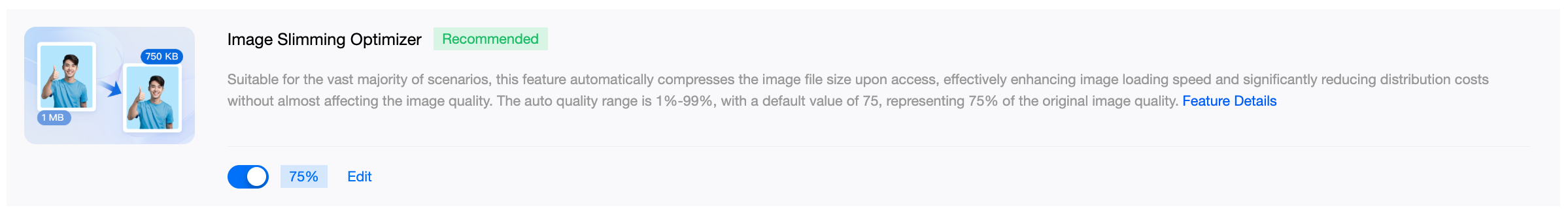 Suitable for most image distribution optimization scenarios. It supports automatic compression of file size when accessing images without changing resolution, dimension, or format, effectively improving loading speed with almost unaffected video quality and reduced distribution cost. Enable with one click—no modification required to business URL parameters. The automatic quality range is 1%-99%, with a default value of 75, representing 75% retention of original image quality.