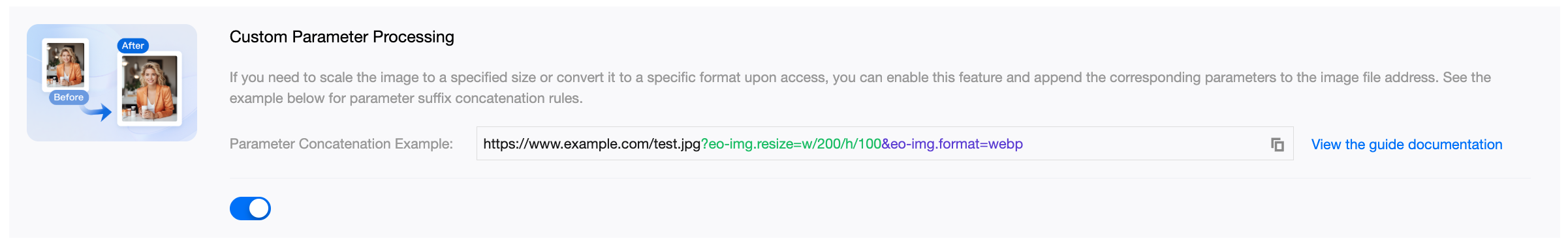4. After enabled, you only need to pass the image scaling demand by concatenating the eo-img related parameter to the Request URL in the Client requests. EdgeOne will automatically complete the image processing based on the image processing parameter in the Request URL. For example: https://www.example.com/foo.png?eo-img.resize=w/100。