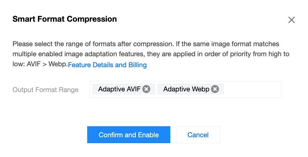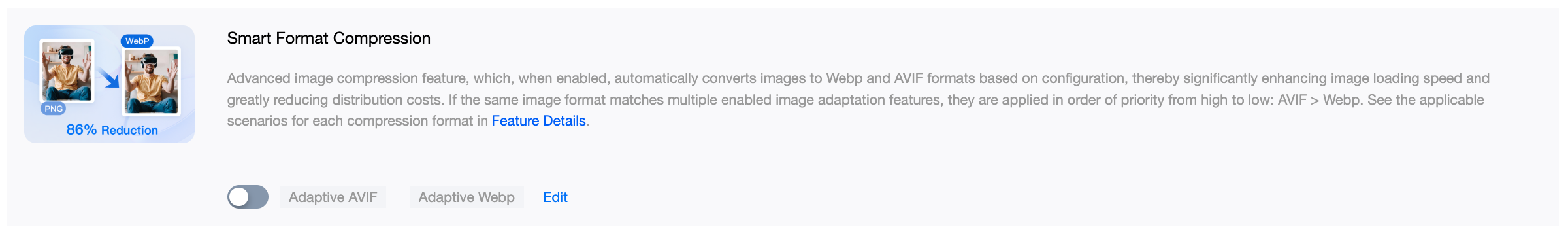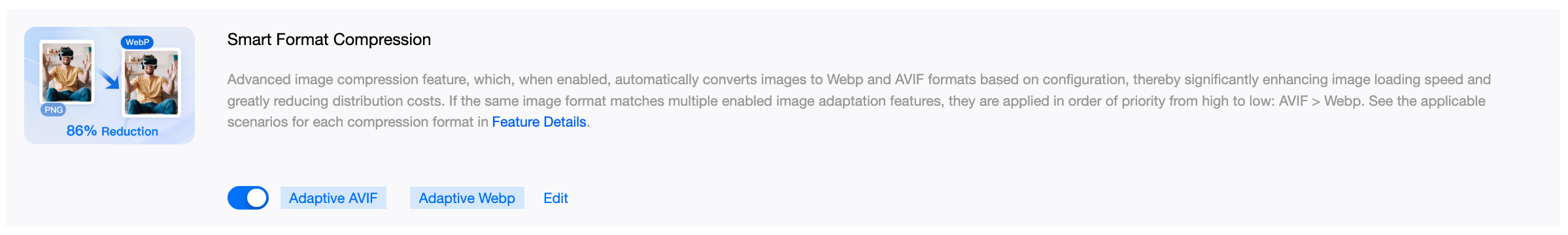 Advanced image volume compression feature. Once enabled, it automatically converts images to Webp or AVIF format based on configuration, thereby significantly improving image loading speed and reducing distribution cost. Supports one-click enable with no modification required to business URL parameters. If the same image format matches multiple enabled image adaptability features, they take effect in priority sequence from high to low: AVIF > Webp. Different compression features vary in compatibility with existing image formats and browser environments. See the table below: