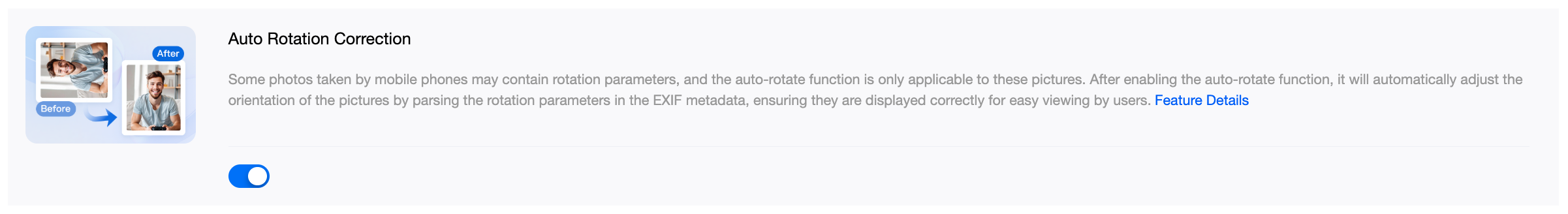 Image slimming optimization, intelligent format compression, and automatic rotation adjustment features may cause a hit rate decline in a short time when enabled with one click. Not recommended to enable during peak business periods.