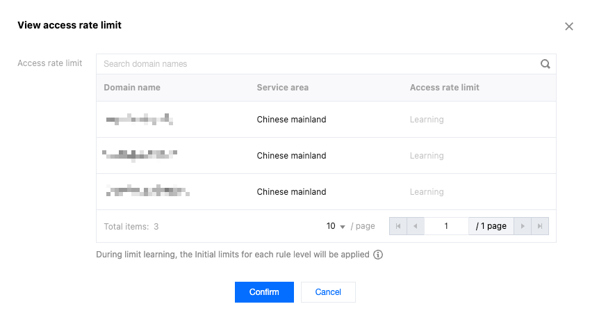 4. View the access rate limit corresponding to the associated domain name of the current protection policy in the pop-up window.