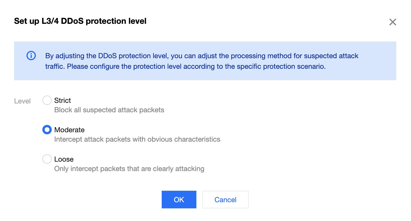 Comparison items | LooseThe cleansing strategy is relatively permissive and only protects against attack packets with explicit attack characteristics. It is recommended to enable this policy when false blocking is suspected, though attack leakage may occur in the event of sophisticated attacks. | Moderate (default)The cleansing strategy is adapted to the vast majority of businesses and can effectively protect against common attacks. Moderate Mode is the default setting for DDoS Protection. | StrictThe cleaning strategy is relatively strict, and it is recommended to use when attack penetration occurs in normal mode. | |
