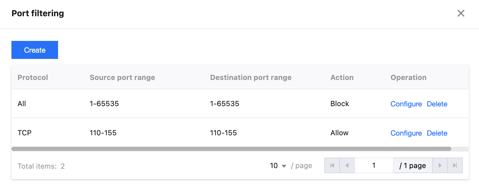 5. In the port filtering page, click on Create to create a port filtering rule. In this scenario, create two rules, intercept all protocols and select TCP protocol, fill in the source port range 1-65535, and fill in the destination port range 10-155 ports, select different protection actions and fill in the relevant fields, and click Save.