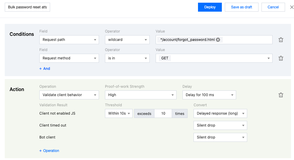 /api/password_reset of the e-commerce site shop.example.com has a large number of failed reset requests from a large amount of IPs with low frequency and no obvious User-Agent or header aggregation. Therefore, the active detection function is used to strengthen the bot protection rules for the password reset API /api/password_reset and the password reset page /account/forgot_password.html, using silent mode to combat against automated bulk password reset tools.shop.example.com, to enter the configuration page for the security policy of the target domain name.*/account/forgot_password.html. Configure the operation to Validate client behavior, the Proof-of-work strength to High, and the delay to Delay for 100 ms :Content-Type is text/html. Other requests will be handled based on the current verification result.