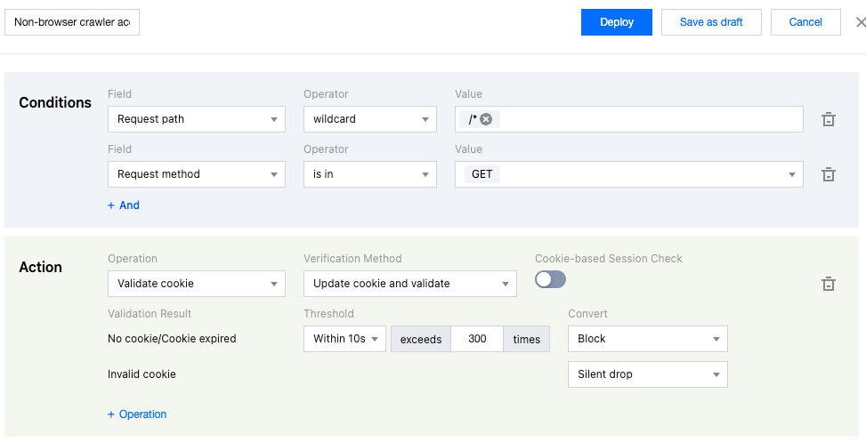 Validation result | For requests that have failed the Cookie verification, the processing can be done according to the check result as follows: No Cookie or expired Cookie: The session information carried in the Cookie header has a time limit and is only valid for a certain period of time. If the request does not carry valid session information or the session information has expired, the session information needs to be updated to pass the Cookie verification. When the client frequently uses requests without session information to access, there may be a risk of harvesting Cookies and hijacking sessions. You can choose to dispose of requests from the request sources (client IP) that do not carry valid session information when the session information is not carried at a specified rate. Trigger threshold: You can configure the upper limit of the number of sessions that can be created without carrying a Cookie or an expired Cookie within a certain period of time, and limit the initiation rate of new sessions. When the trigger threshold is exceeded, it will be processed according to the configured action. Invalid cookie: The session information issued by EdgeOne has encryption verification capabilities, and tampering with session information often means malicious requests. You can choose to dispose of requests with tampered session information. |