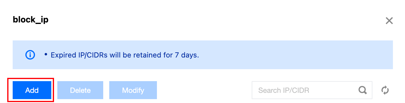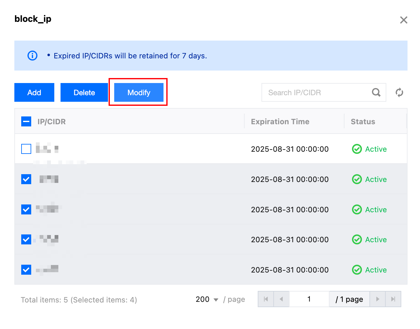 4. On the editing page, select the IP address or ranges that need expiry time adjustment, then click Modify.