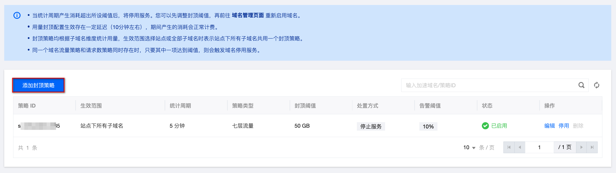 封顶配置 | 选择封顶配置的策略类型,同一个域名流量、带宽和请求数策略同时存在时,只要其中一项达到阈值,则会触发域名停用服务: 七层流量:表示对七层流量设置最高封顶阈值,单位可选择 MB,GB,TB。 HTTP/HTTPS 请求数:表示对 HTTP/HTTPS 请求数设置最高封顶阈值,单位可选择万次,百万次,亿次。 七层带宽:表示对七层带宽设置最高封顶阈值,单位可选择 Mbps,Gbps,Tbps。 |