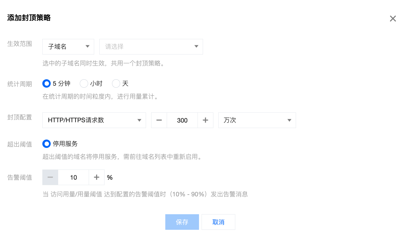 超出阈值 | 停用服务:表示触发封顶阈值时,将会对生效范围内的所有子域名做停服处理。 |