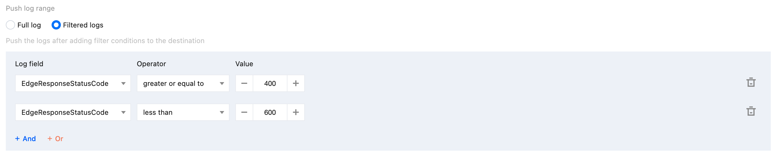 Currently, only Real-time Logs - Site Acceleration Logs support the configuration of push log filter conditions.