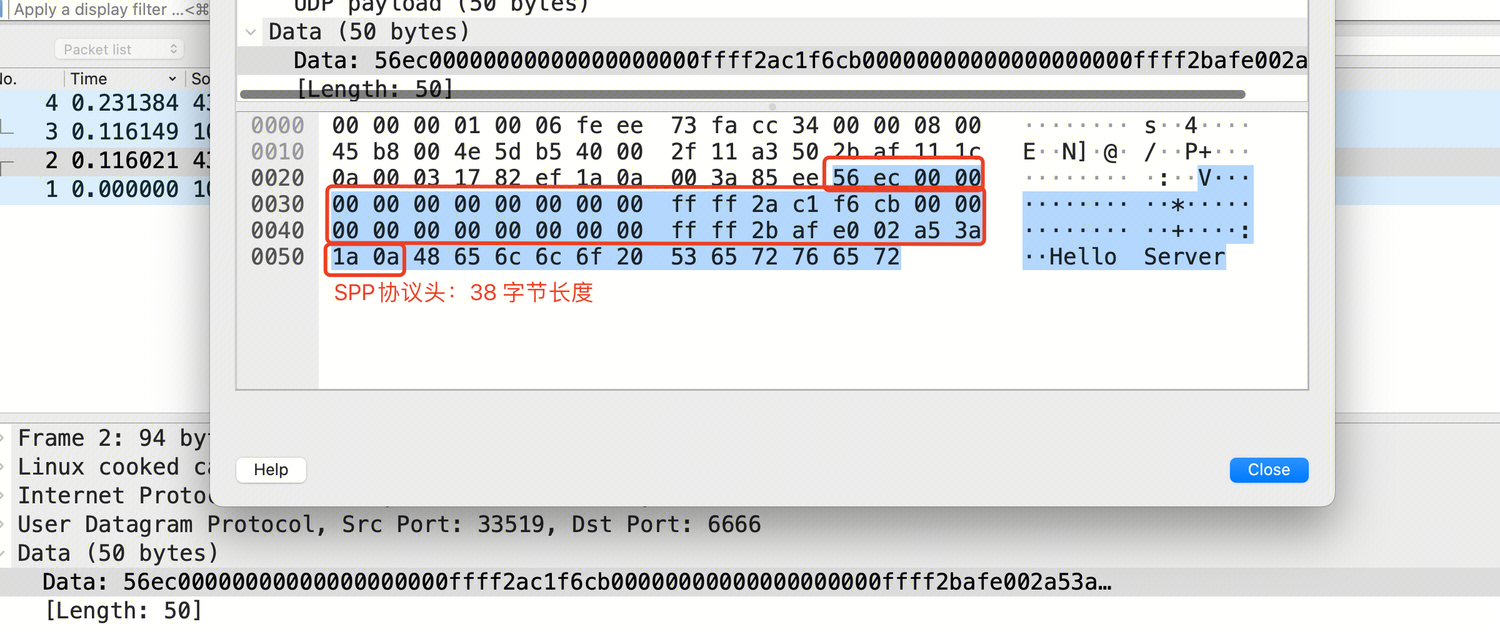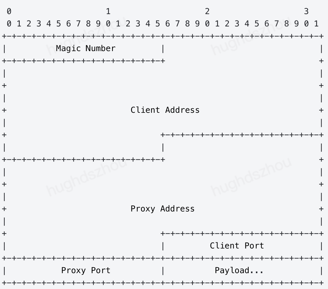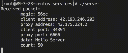 package mainimport ("encoding/binary""fmt""net")type NetworkConnection struct {Magic uint16ClientAddr net.IPProxyAddr net.IPClientPort uint16ProxyPort uint16}func handleConn(conn *net.UDPConn) {buf := make([]byte, 1024) // Create a buffer.n, addr, err := conn.ReadFromUDP(buf) // Read the data packet from the connection.if err != nil {fmt.Println("Error reading from UDP connection:", err)return}// Convert the received bytes to a NetworkConnection struct.nc := NetworkConnection{Magic: binary.BigEndian.Uint16(buf[0:2]),ClientAddr: make(net.IP, net.IPv6len),ProxyAddr: make(net.IP, net.IPv6len),}if nc.Magic == 0x56EC {copy(nc.ClientAddr, buf[2:18])copy(nc.ProxyAddr, buf[18:34])nc.ClientPort = binary.BigEndian.Uint16(buf[34:36])nc.ProxyPort = binary.BigEndian.Uint16(buf[36:38])// Print the SPP header information, including magic, real client IP and port, as well as proxy IP and port.fmt.Printf("Received packet:\\n")fmt.Printf("\\tmagic: %x\\n", nc.Magic)fmt.Printf("\\tclient address: %s\\n", nc.ClientAddr.String())fmt.Printf("\\tproxy address: %s\\n", nc.ProxyAddr.String())fmt.Printf("\\tclient port: %d\\n", nc.ClientPort)fmt.Printf("\\tproxy port: %d\\n", nc.ProxyPort)// Print the actual and effective payload.fmt.Printf("\\tdata: %v\\n\\tcount: %v\\n", string(buf[38:n]), n)} else {// Print the actual and effective payload.fmt.Printf("\\tdata: %v\\n\\tcount: %v\\n", string(buf[0:n]), n)}// Respond with a packet. Note: The 38-byte SPP header must be returned completely.response := make([]byte, n)copy(response, buf[0:n])_, err = conn.WriteToUDP(response, addr) // Send data.if err != nil {fmt.Println("Write to udp failed, err: ", err)}}func main() {localAddr, _ := net.ResolveUDPAddr("udp", ":6666") // Create a UDP address using the local address and port.conn, err := net.ListenUDP("udp", localAddr) // Create a listener.if err != nil {panic("Failed to listen for UDP connections:" + err.Error())}defer conn.Close() // Close the connection at the end.for {handleConn(conn) // Handle the incoming connection.}}