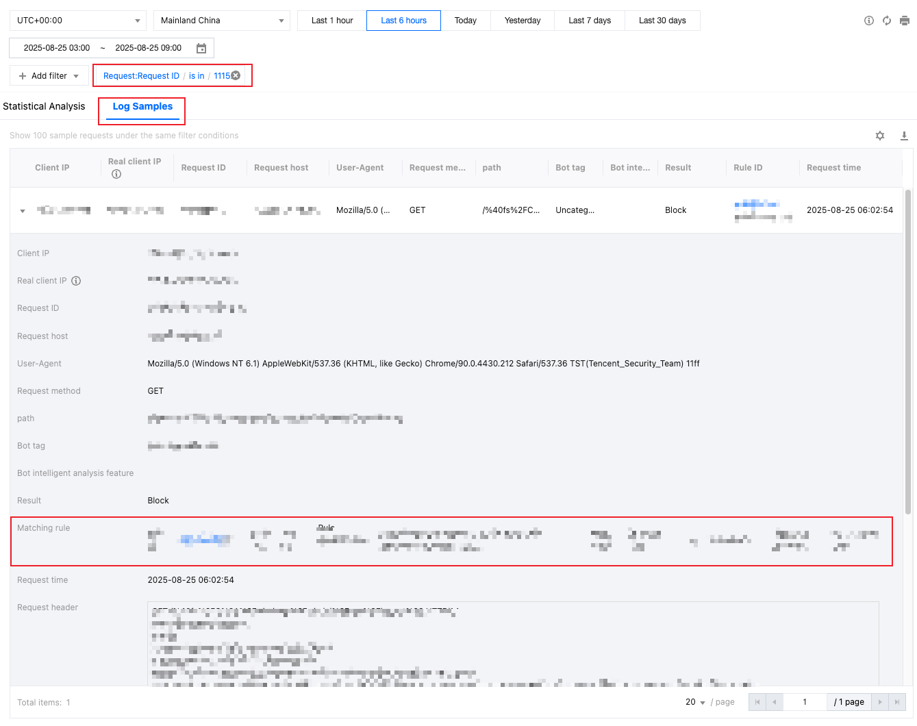 Log samples: Help you further view the details of security events and determine whether the security policy hit by the request meets expectations. For example: You can view the managed rules hit by the request and the field content matched by the managed rules through sample logs, which will help you determine whether it is a false intercept and adjust the security policy accordingly.