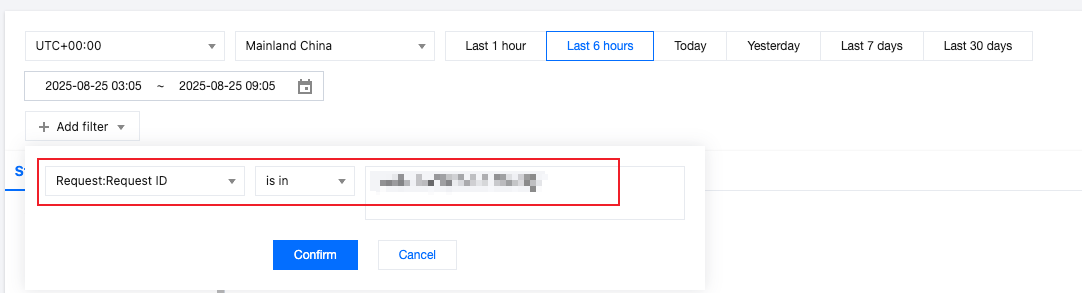 3. In the filter conditions, select Request ID, enter the request ID shown on the interception page, and click Confirm.