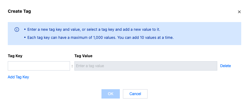 2. In the pop-up window, add the corresponding tag key and tag value, and click OK to complete the tag binding.