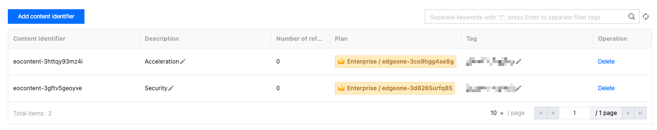 Option 2: Implement via EdgeOne content identifier associated with designated domain name method: 1. Create a content identifier to identify domain names responsible for the acceleration department and security group, and associate tags with the content identifier.