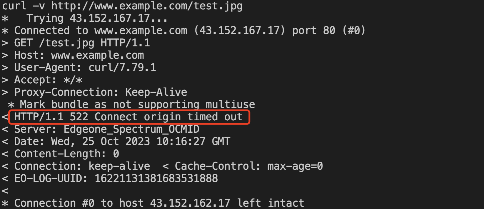 Use CURL to obtain an EO-LOG-UUID, submit it to Tencent Cloud technical support, and have them check the IP of the EdgeOne return node. Verify whether the return node IP is in the origin's IP whitelist. The method to obtain the UUID is as follows: